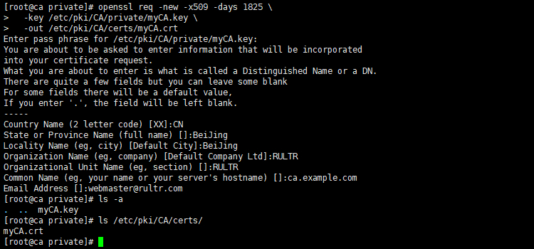 # openssl req -new -x509 -days 1825 \ -key /etc/pki/CA/private/myCA.key \ -out /etc/pki/CA/certs/myCA.crt