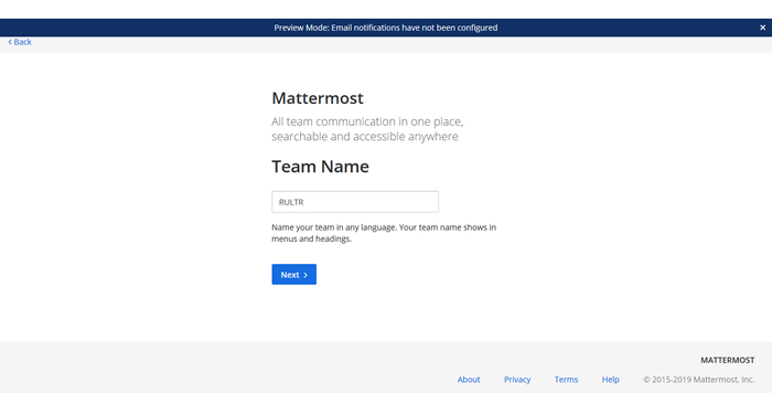 填写邮件、用户名以及密码后,点击”Create Account”按钮创建 Mattermost 管理账户。帐户创建成功后,会进入创建 Team 页面: