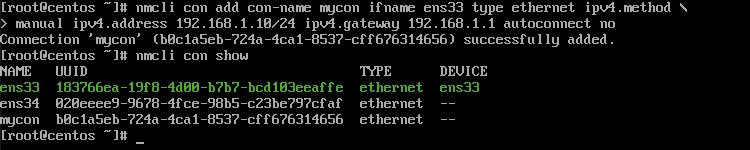 # nmcli con add con-name mycon ifname ens33 type ethernet ipv4.method manual ipv4.address 192.168.1.1/24 ipv4.gateway 192.168.1.1 autoconnect no # nucli con show