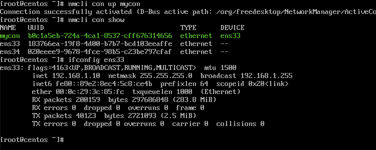 # nmcli con up mycon # nmcli con show # ifconfig ens33