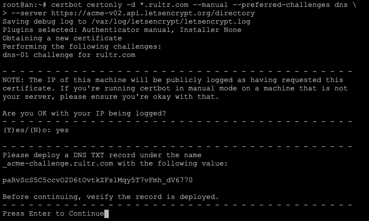 之后,certbot 工具要求对域名进行验证,需要在域名”rultr.com”下添加一条 txt 记录”_acme-challenge”,记录值为”zkkHBfrWRG8yghiF8Z1Ob9Tyu_sKGIxAxGZ2BupyCP4″。