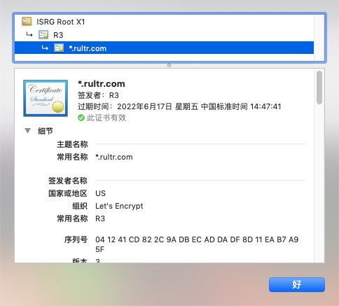 命令执行成功后,生成的证书保存在”/etc/letsencrypt/live/rultr.com/”目录里,可以供 Web 服务器使用了。