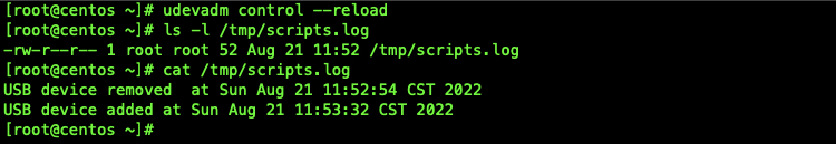 最后,就可以插拔 U 盘来看自定义规则是否被正确执行了。如果脚本被正确执行,在 U 盘的插拔事件后,都会在 /tmp/scripts.log 文件中产生相应的内容,查看该文件内容即可验证自定义规则是否生效了: