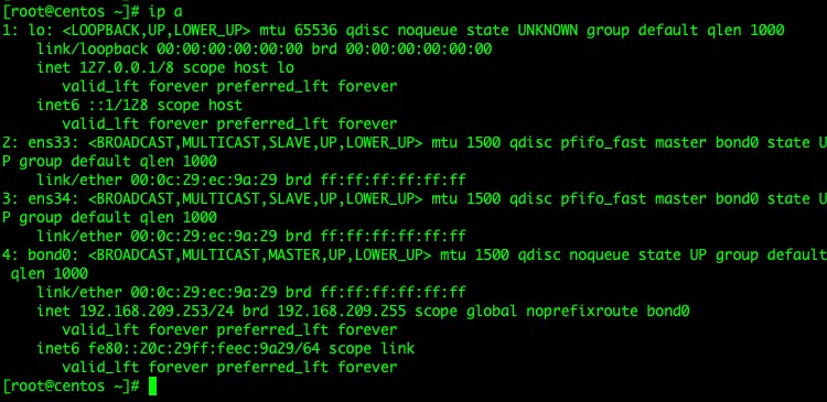 # /etc/sysconfig/network-scripts/ifcfg-ens33 TYPE=Ethernet BOOTPROTO=none DEVICE=ens33 ONBOOT=yes MASTER=bond0 SLAVE=yes # /etc/sysconfig/network-scripts/ifcfg-ens34 TYPE=Ethernet BOOTPROTO=none DEVICE=ens34 ONBOOT=yes MASTER=bond0 SLAVE=yes