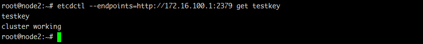 # etcdctl --endpoints=http://172.16.100.1:2379 put testkey "cluster working"