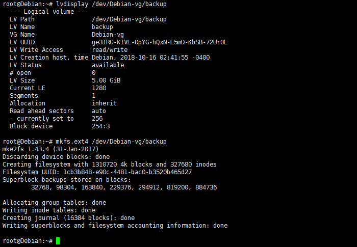 # mkfs.ext4  /dev/Debian-vg/backup