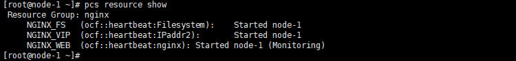 可以看到,所有群集资源均已经启动,并且所有资源均归属于 node-1 节点。