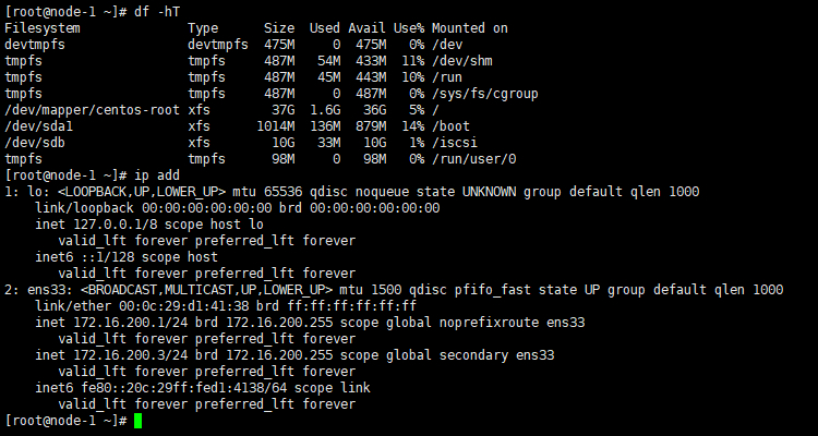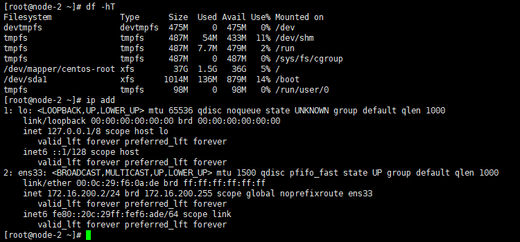 此时,就可以分别查看两个节点的文件系统及 IP 地址信息: