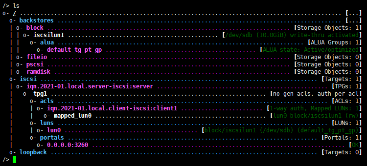 /> cd /iscsi/iqn.2021-01.local.server-iscsi:server/tpg1/acls/iqn.2021-01.local.client-iscsi:client1/