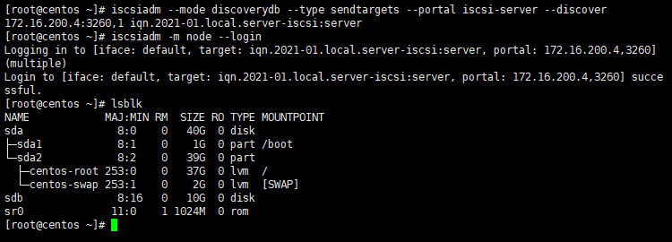 全部完成后,使用如下命令发现并连接 iSCSI 目标: