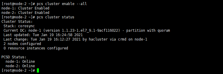 通过上面的命令,我们可以建立一个新群集。使用”–name”参数设置群集的名称,示例中使用”HA_cluster”,并添加了 node- 1 和 node-2 作为群集中的节点。”–start”和”–enable”的参数将同时影响群集中两个节点上的群集服务。
