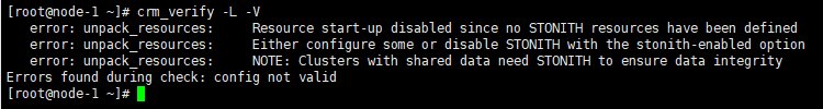 看到一堆的错误也不要头大,这只是意味着验证工具发现有关 Fencing 设置的一些错误,因为在默认情况下启用了STONITH。演示方便起见,我们将禁用此功能。而对于生产环境的群集,则不建议禁用此项。