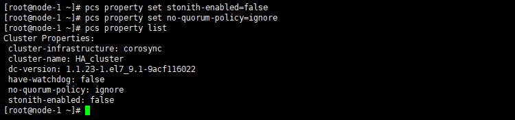 使用以下命令禁用 STONITH 并忽略仲裁策略,并检查”群集属性”的状态以确保两者均被禁用:
