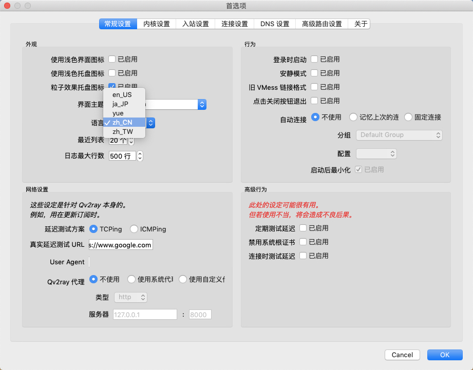 可以将 Language 选择项设置为”zh_CN”,Qv2ray 界因就会以中文显示,方便使用: