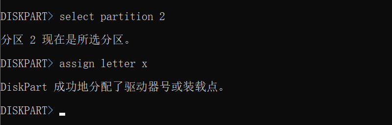 选择好分区后,就可以为该分区分配一个标识符了,根据 Windows 的使用习惯,系统分区一般使用 C,之后是其它分区以及外接存储设备。我们现在将 X 分配给系统分区,这可以最大程度避免与其它设备重复。分配驱动器号使用如下命令: