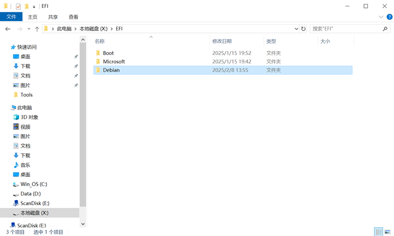 使用 Windows 的文件资源管理器,进入 X 盘,就可以看到一个 “EFI”文件夹,进入该文件夹,就可以看到启动菜单中不同系统的启动项文件夹,示例是 Windows 和 Debian,将不再使用 Debian 文件夹删除即可。