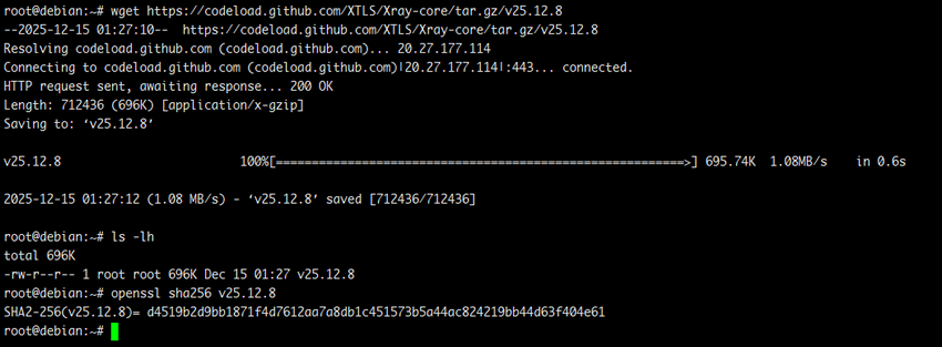 $ wget https://codeload.github.com/XTLS/Xray-core/tar.gz/v25.12.8 $ openssl sha256 v25.12.8 SHA2-256(v25.12.8)= d4519b2d9bb1871f4d7612aa7a8db1c451573b5a44ac824219bb44d63f404e61