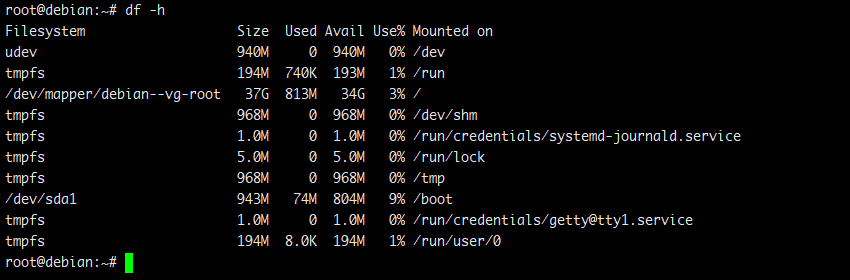 使用 “-h”参数(”df -h”)会以”人类可读”的格式显示文件系统磁盘空间统计信息,这意味着它会以字节、兆字节和千兆字节为单位显示详细信息。