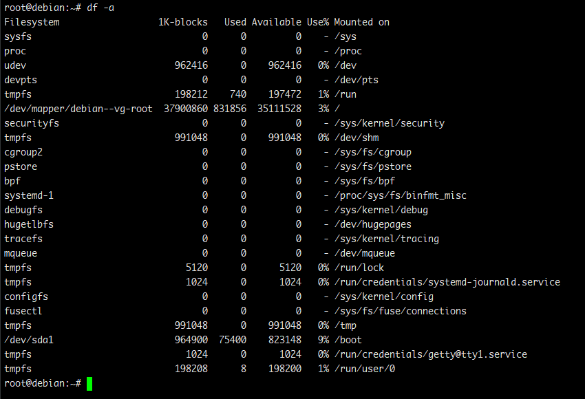 它还会显示伪文件系统,例如 tmpfs、sysfs、proc 和 devtmpfs–这些伪文件系统通常显示 0 个块,并且默认情况下处于隐藏状态。