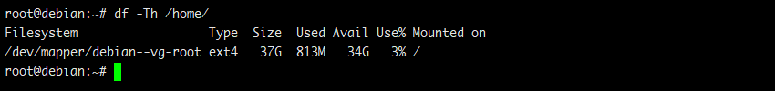 命令”df -hT /home”用于以人类可读的格式显示 /home 目录或分区的磁盘空间使用情况。其中的 -T 选项会连同其他信息一并显示文件系统类型(ext4)。