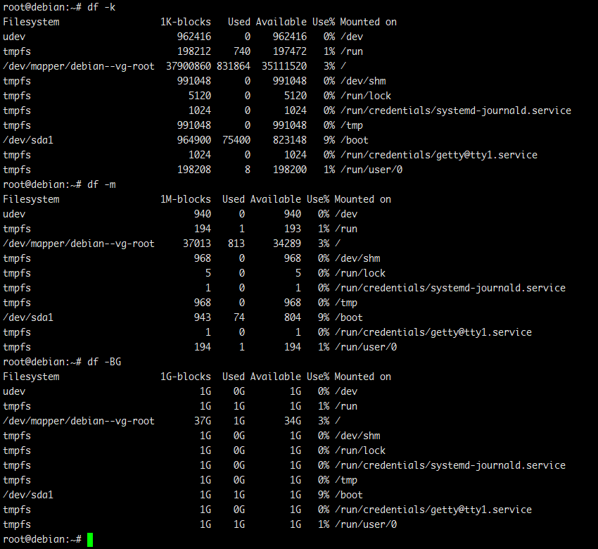 # df -k # df -m # df -BG