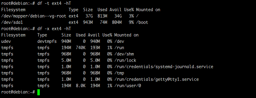 # df -t ext4 # df -x tmpfs