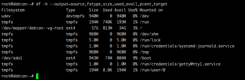 # df -h --output=source,fstype,size,used,avail,pcent,target