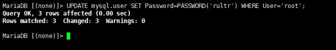 MariaDB [(none)]> UPDATE mysql.user SET Password=PASSWORD('rultr') WHERE User='root';