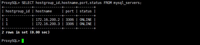 ProxySQL> SELECT hostgroup_id,hostname,port,status FROM mysql_servers;