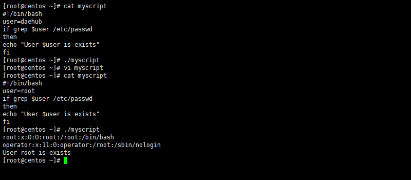 #!/bin/bash user=daehub if grep $user /etc/passwd then echo "User $user is exists" fi