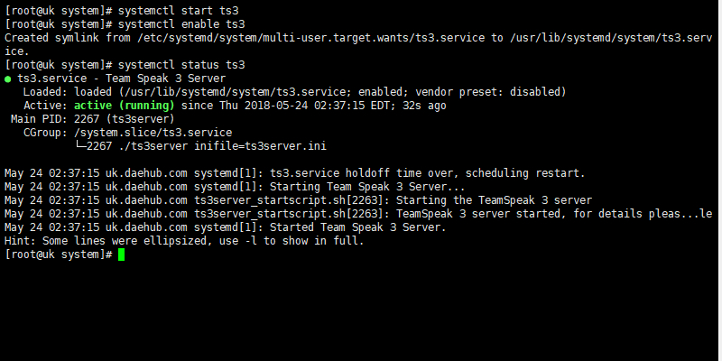 # systemctl start ts3 # systemctl enable ts3 # systemctl status ts3