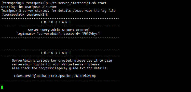 # su - teamspeak $ cd teamspeak3/ $ ./ts3server_startscript.sh start