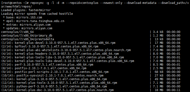 # reposync -g -l -d -m --repoid=base --newest-only --download-metadata --download_path=/var/www/html/repos/ # reposync -g -l -d -m --repoid=centosplus --newest-only --download-metadata --download_path=/var/www/html/repos/ # reposync -g -l -d -m --repoid=extras --newest-only --download-metadata --download_path=/var/www/html/repos/ # reposync -g -l -d -m --repoid=updates --newest-only --download-metadata --download_path=/var/www/html/repos/