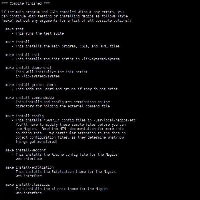 # make install-init //安装nagios初始化脚本 # make install-commandmode //安装命令行模式 # make install-config //安装示例配置文件 # make install-daemoninit //安装nagios成为systemd服务