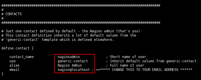 Nagios 具有告警邮件提醒功能,需要修改”/usr/local/nagios/etc/objects/contacts.cfg”文件,示例内容如下: