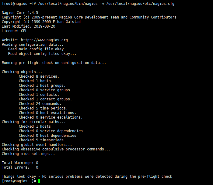 以上已经完成了 Nagios 的全部配置,现在使用如下命令验证配置是否存在问题:
