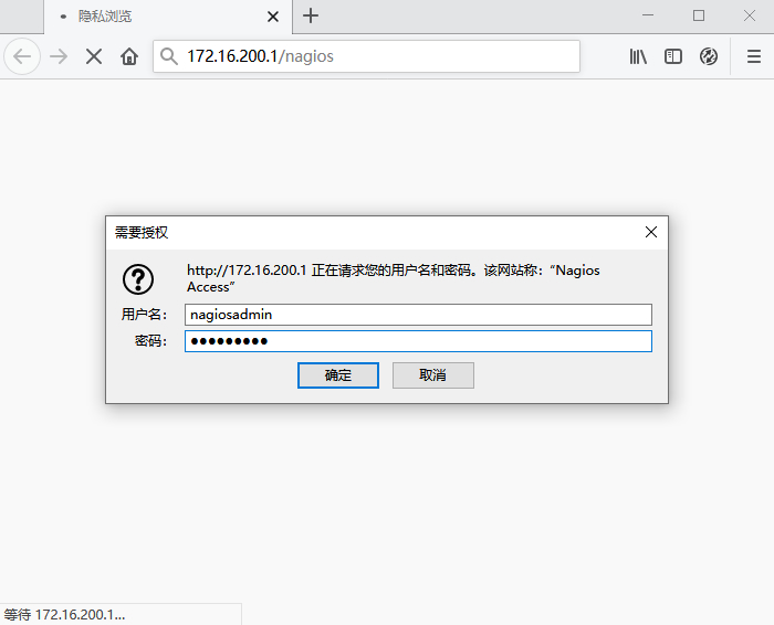 输入用户名”nagiosadmin”和之前设置的密码,点击”确定”登录: